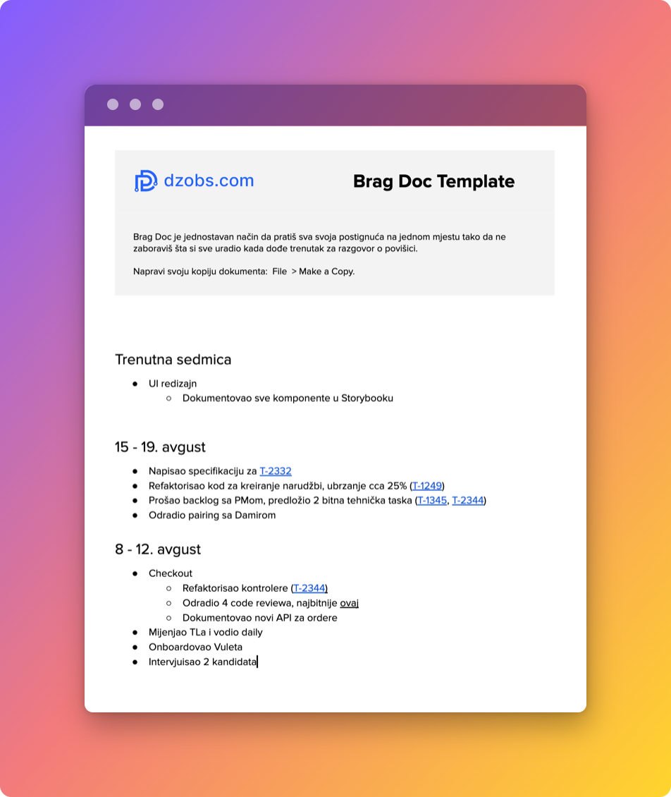 Međutim, svega ovoga se može biti teško sjetiti prilikom razgovora, zbog čega je važno da vodiš tzv. Brag Doc. To je jednostavna lista postignuća organizovana po radnoj sedmici.